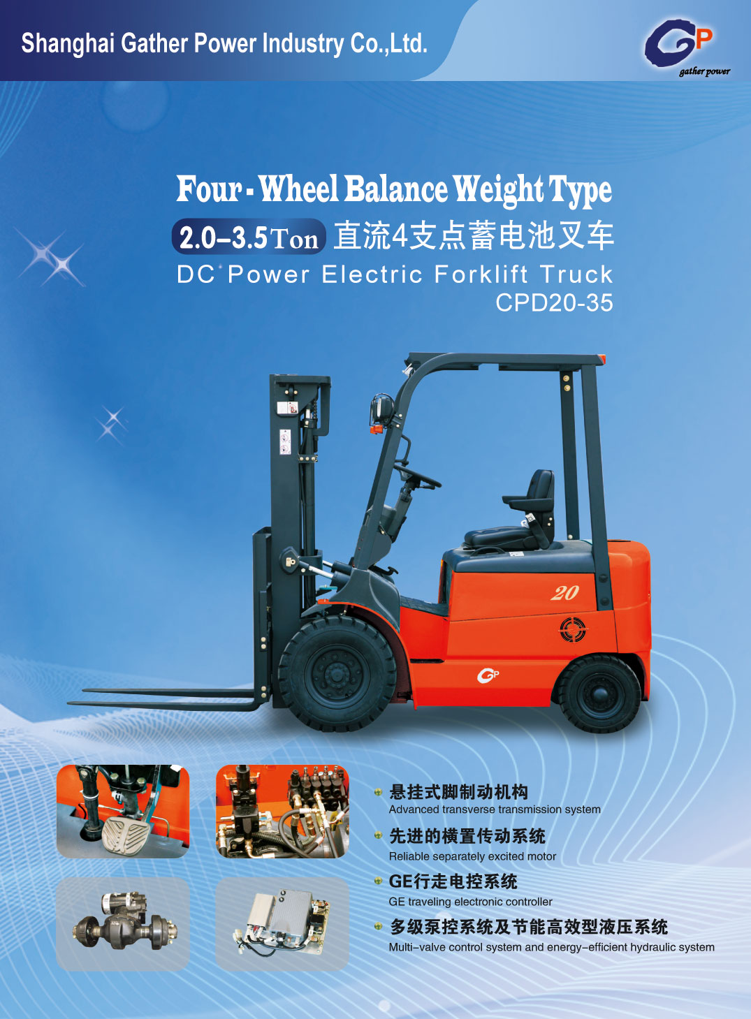 Shanghai Gather Power Industry Co., Ltd was established in 2003 in Fengxian District, Shanghai, China, has two Joint-stock manufacturing factory. GP currently have more than 800 staffs, among whom 40% are university staff, including 60 engineers and technical researchers. Most of the 60 technicians have many years experience in forklift manufacturing industry, with rich experience and comprehensive technology, they served as a Chief Engineer or Assistant Chief Engineer in well-known forklift manufacturing enterprises.